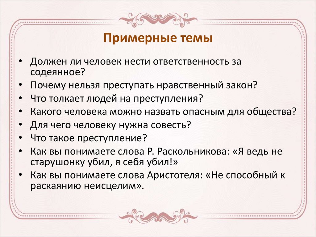 Примерные темы• Должен ли человек нести ответственность за