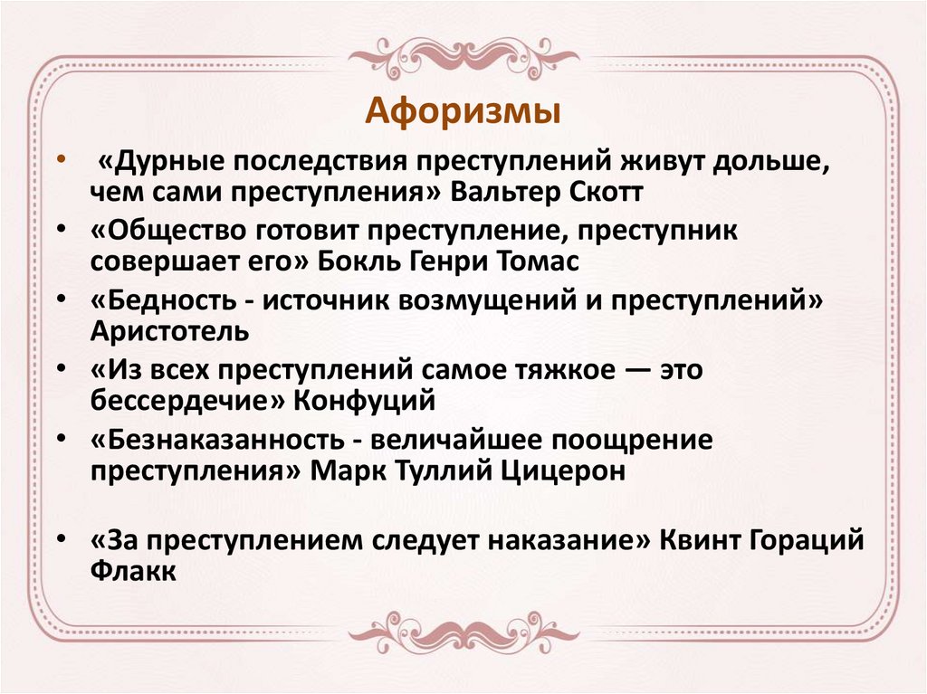 Афоризмы• «Дурные последствия преступлений живут дольше,