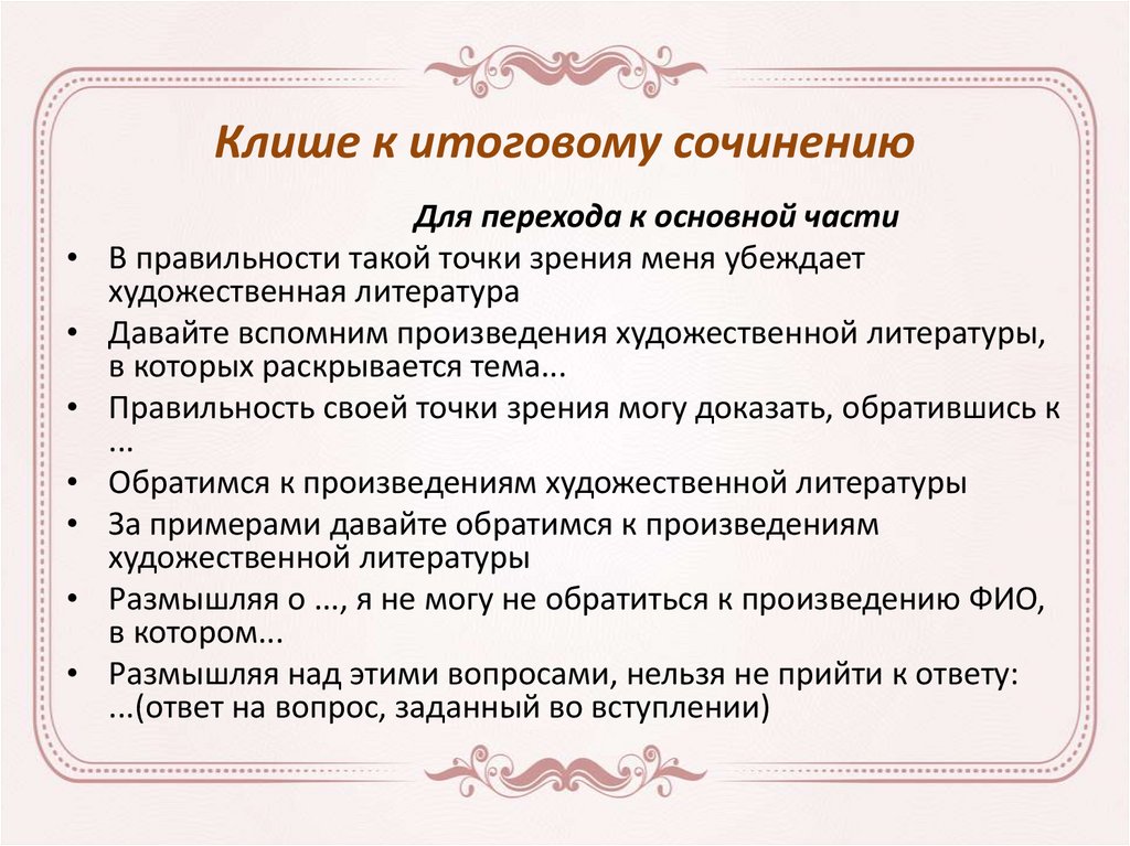 Клише к итоговому сочинениюДля перехода к основной части