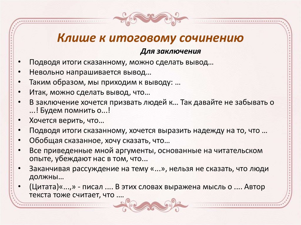 Клише к итоговому сочинениюДля заключения