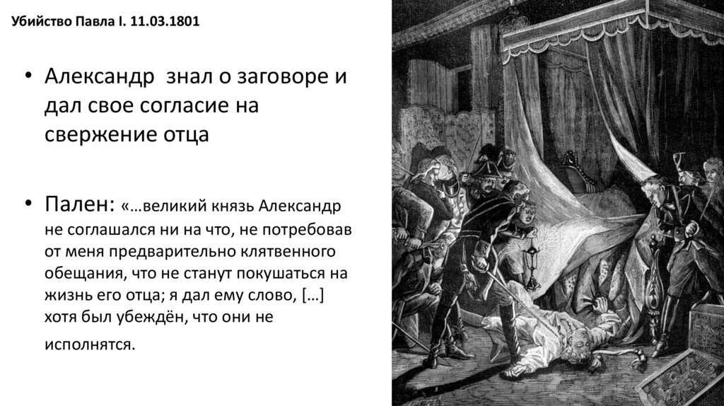 Убийство Павла I. 11.03.1801• Александр знал о заговоре и