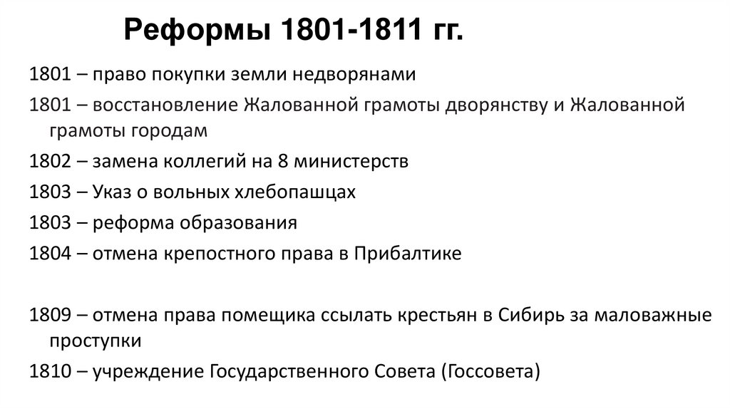 Реформы 1801-1811 гг.1801 – право покупки земли недворянами