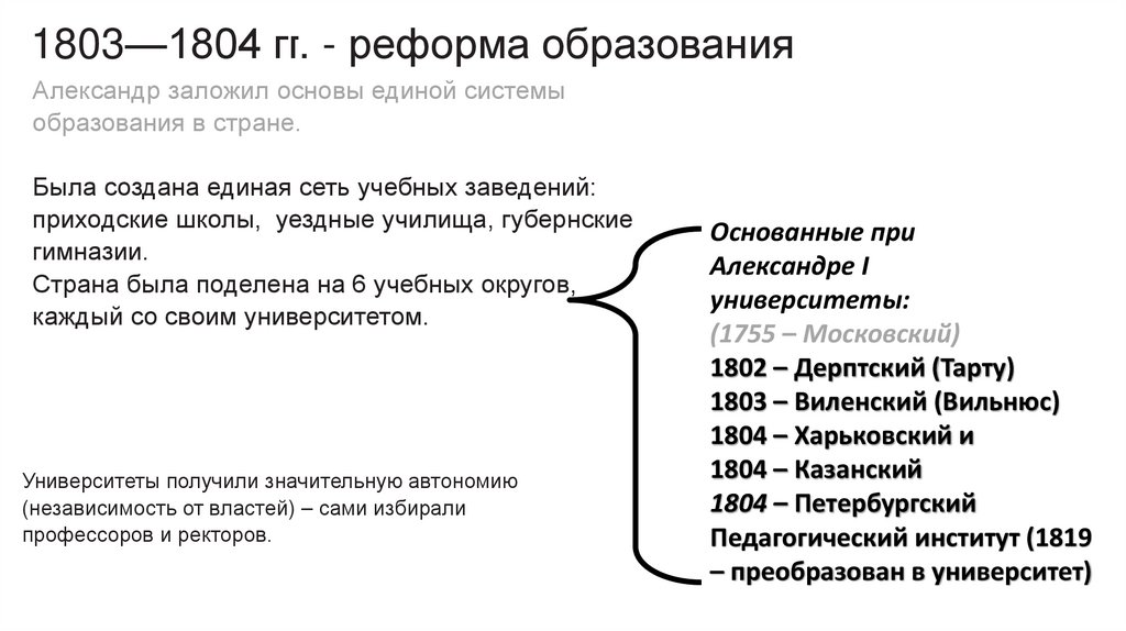 1803—1804 гг. - реформа образованияАлександр заложил основы единой системы