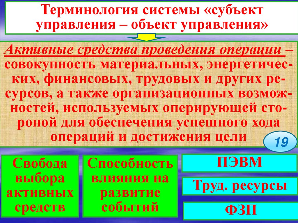 совокупность материальных, энергетических, финансовых, трудовых и других ресурсов, а также организационных возможностей, используемых оперирующей стороной для обеспечения успешного хода