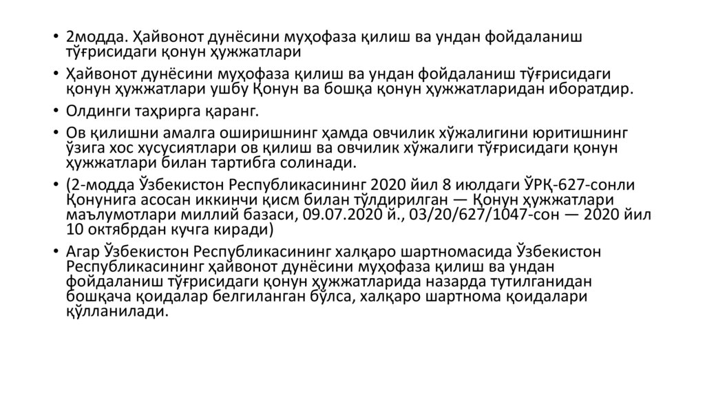 • 2модда. Ҳайвонот дунёсини муҳофаза қилиш ва ундан фойдалаништўғрисидаги қонун ҳужжатлари