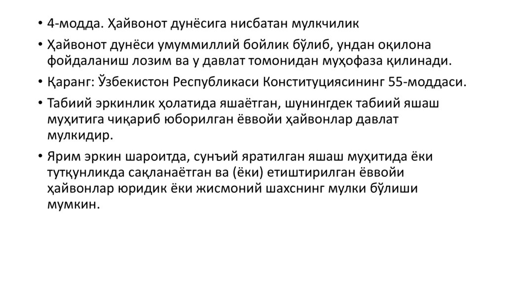 • 4-модда. Ҳайвонот дунёсига нисбатан мулкчилик• Ҳайвонот дунёси умуммиллий бойлик бўлиб, ундан оқилона