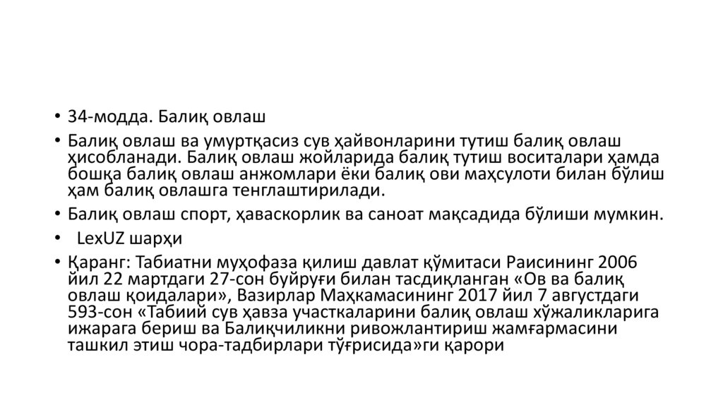 • 34-модда. Балиқ овлаш• Балиқ овлаш ва умуртқасиз сув ҳайвонларини тутиш балиқ овлаш