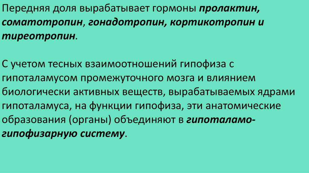 Передняя доля вырабатывает гормоны пролактин,соматотропин, гонадотропин, кортикотропин и