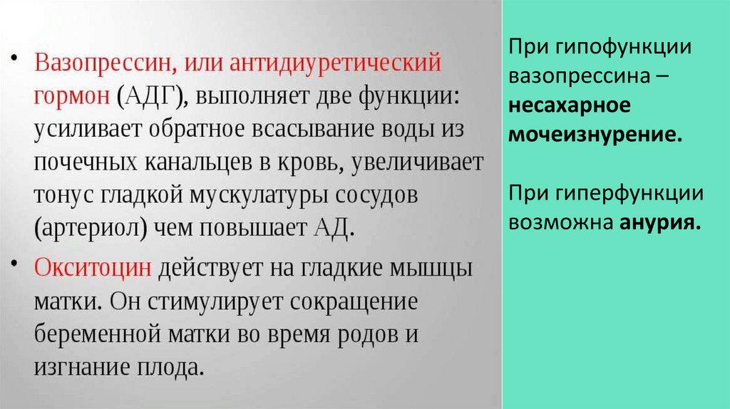 Задняя доля гипофиза (нейрогипофиз) гормоны не синтезирует.Вазопрессин и окситоцин, синтезируемые ядрами гипоталамуса,