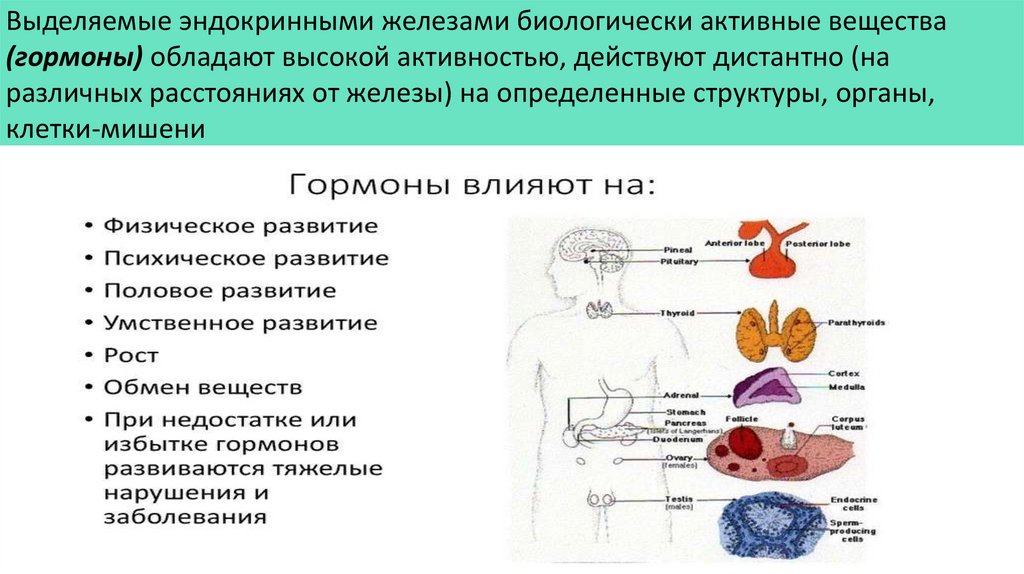 Выделяемые эндокринными железами биологически активные вещества(гормоны) обладают высокой активностью, действуют дистантно (на