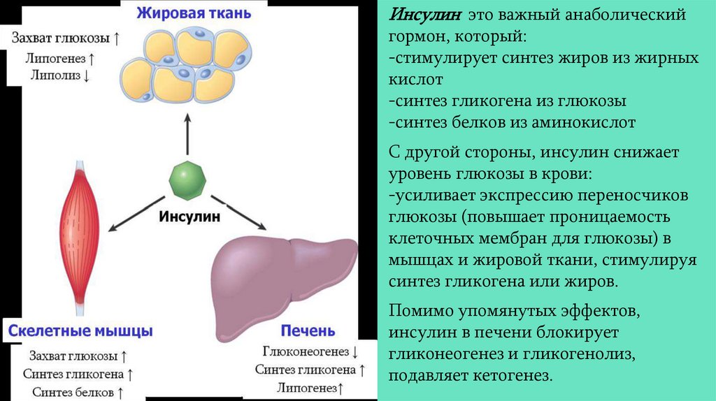 В результате недостаточности инсулина угнетается переход жиров в