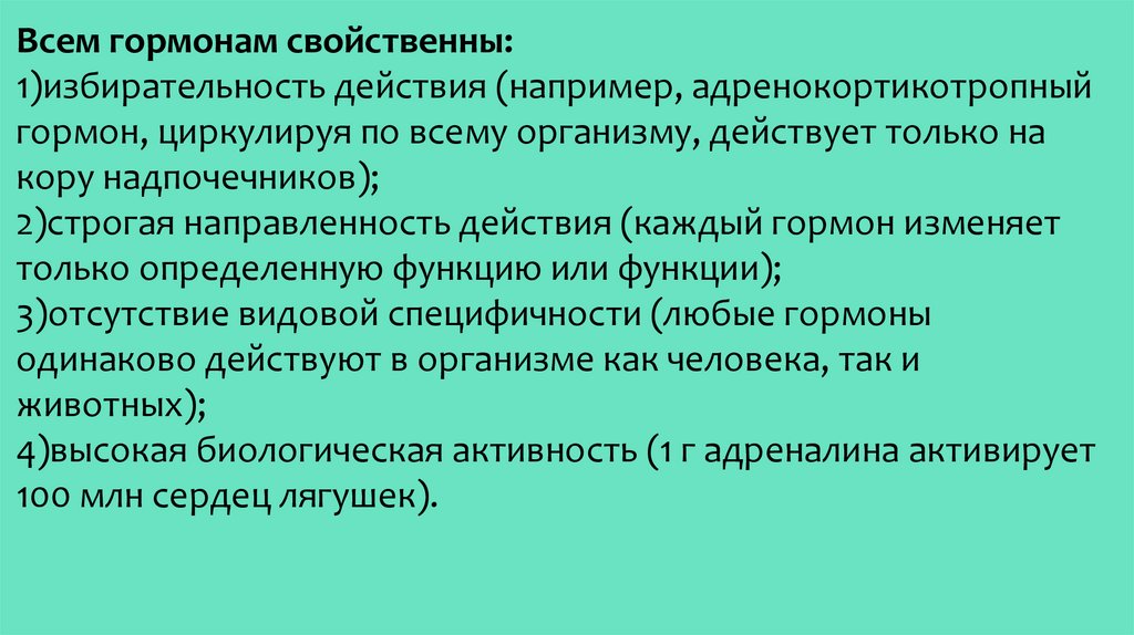 Всем гормонам свойственны:1)избирательность действия (например, адренокортикотропный