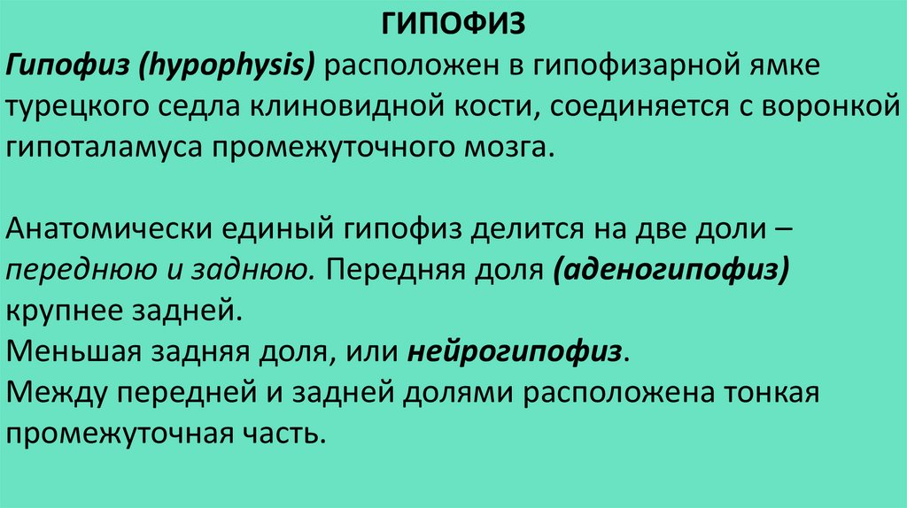 ГИПОФИЗГипофиз (hypophysis) расположен в гипофизарной ямке