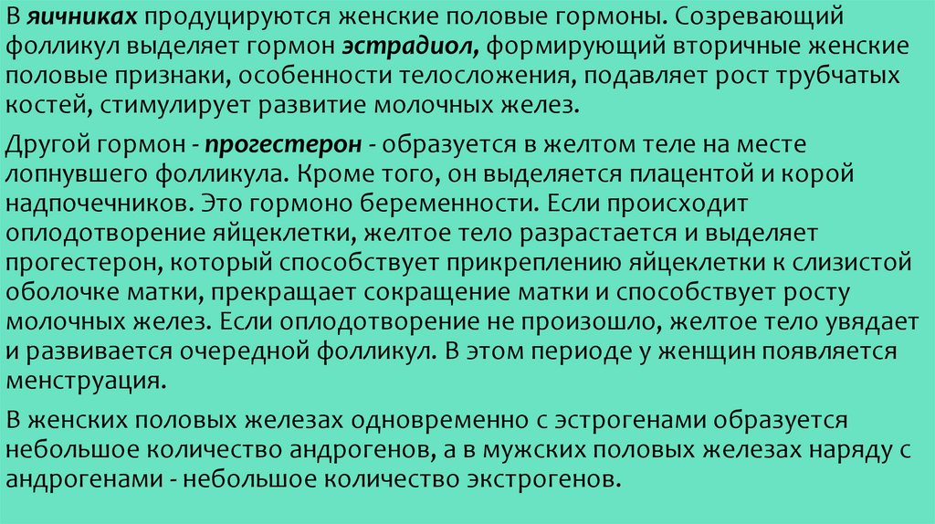 В яичниках продуцируются женские половые гормоны. Созревающийфолликул выделяет гормон эстрадиол, формирующий вторичные женские