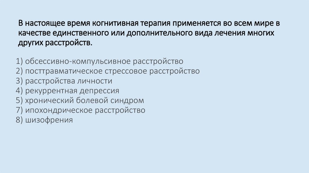 В настоящее время когнитивная терапия применяется во всем мире вкачестве единственного или дополнительного вида лечения многих
