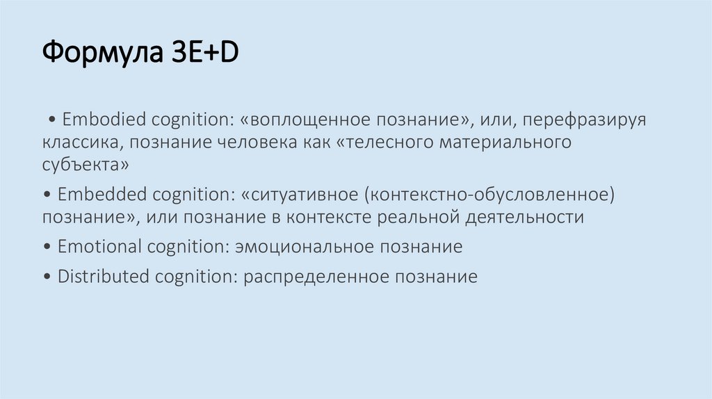 Формула 3E+D• Embodied cognition: «воплощенное познание», или, перефразируя