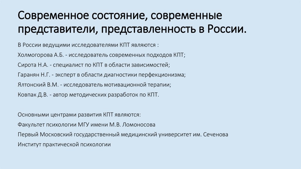 В России ведущими исследователями КПТ являются :
