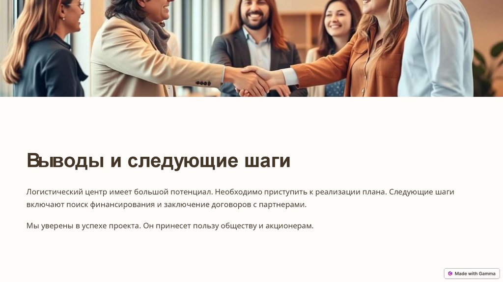 Выводы и следующие шагиЛогистический центр имеет большой потенциал. Необходимо приступить к реализации плана. Следующие шаги