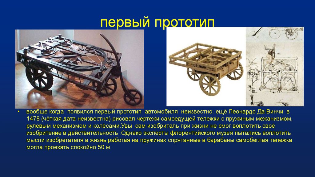 первый прототипвообще когда появился первый прототип автомобиля неизвестно. ещё Леонардо Да Винчи в