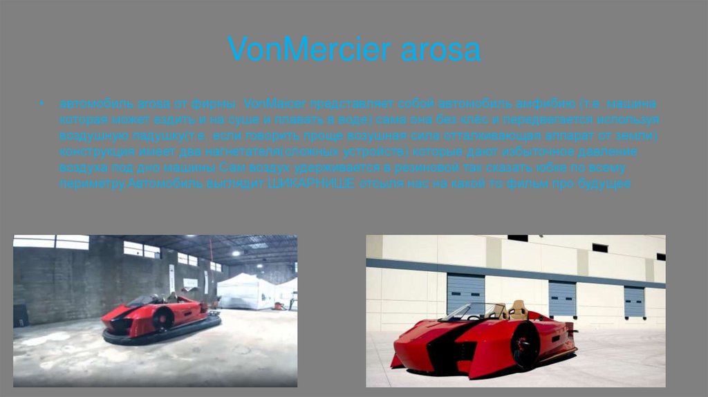 VonMercier arosaавтомобиль arosa от фирмы VonMaicer представляет собой автомобиль амфибию (т.е. машина