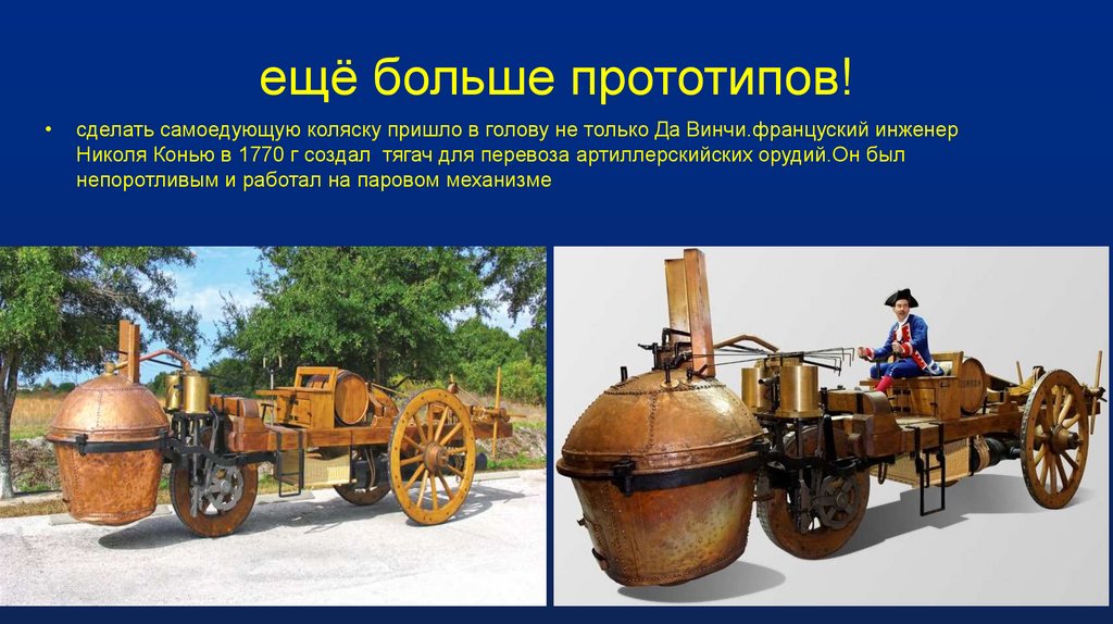 ещё больше прототипов!сделать самоедующую коляску пришло в голову не только Да Винчи.француский инженер