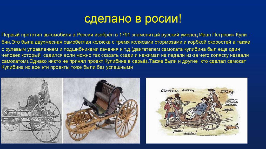 сделано в росии!Первый прототип автомобиля в России изобрёл в 1791 знаменитый русский умелец Иван Петрович Кули бин.Это была двухмесная самобеглая коляска с тремя колясами стормозами и корбкой скоростей а также