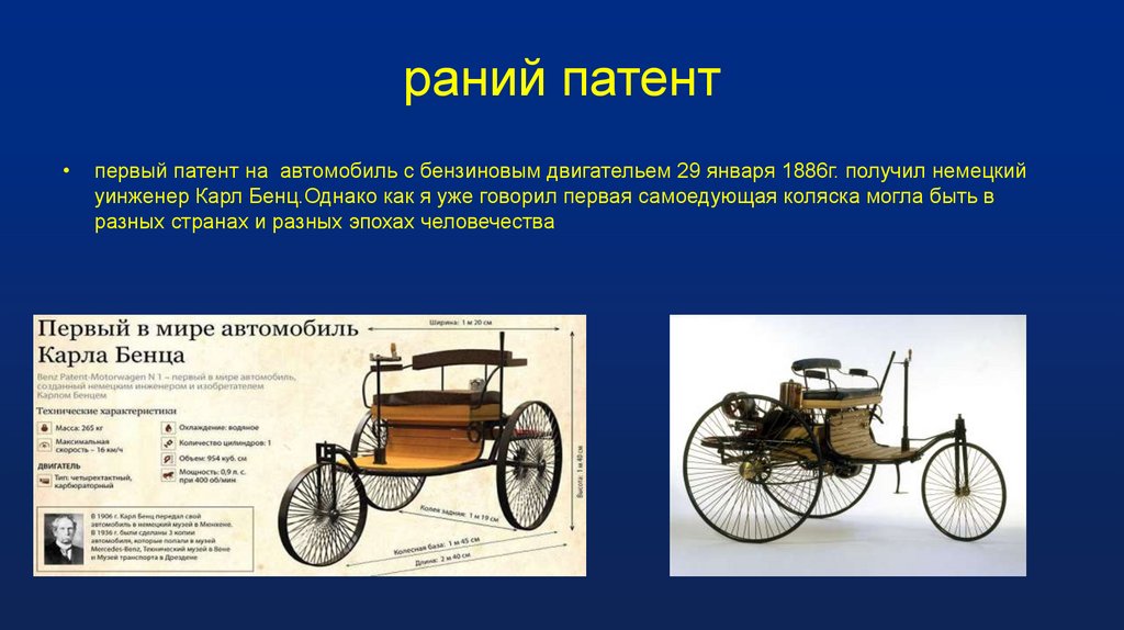 раний патентпервый патент на автомобиль с бензиновым двигательем 29 января 1886г. получил немецкий