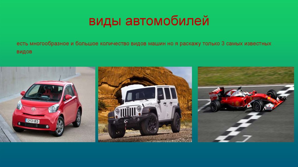 виды автомобилейесть многообразное и большое количество видов машин но я раскажу только 3 самых известных