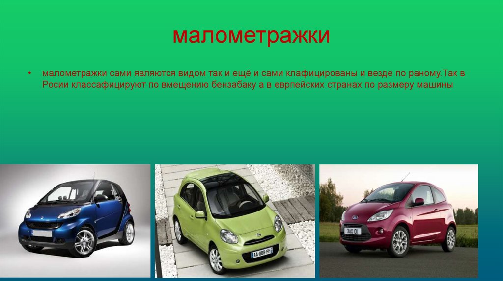 малометражкималометражки сами являются видом так и ещё и сами клафицированы и везде по раному.Так в