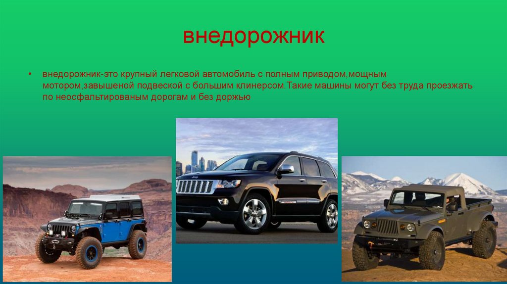 внедорожниквнедорожник-это крупный легковой автомобиль с полным приводом,мощным