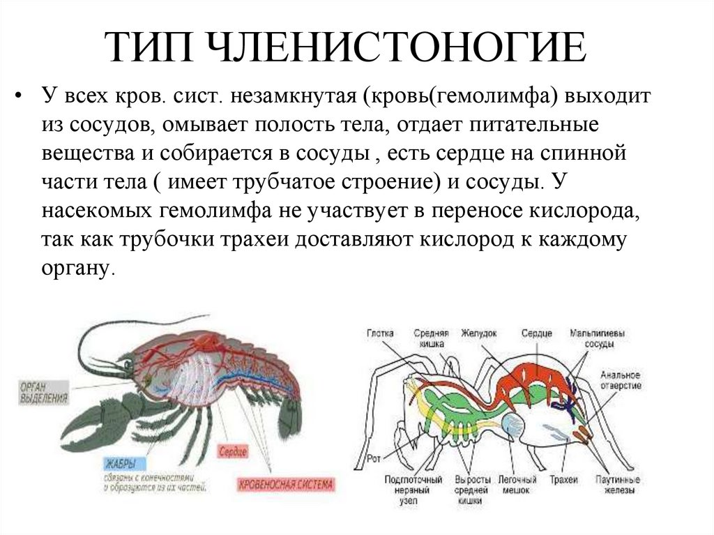ТИП ЧЛЕНИСТОНОГИЕ• У всех кров. сист. незамкнутая (кровь(гемолимфа) выходит