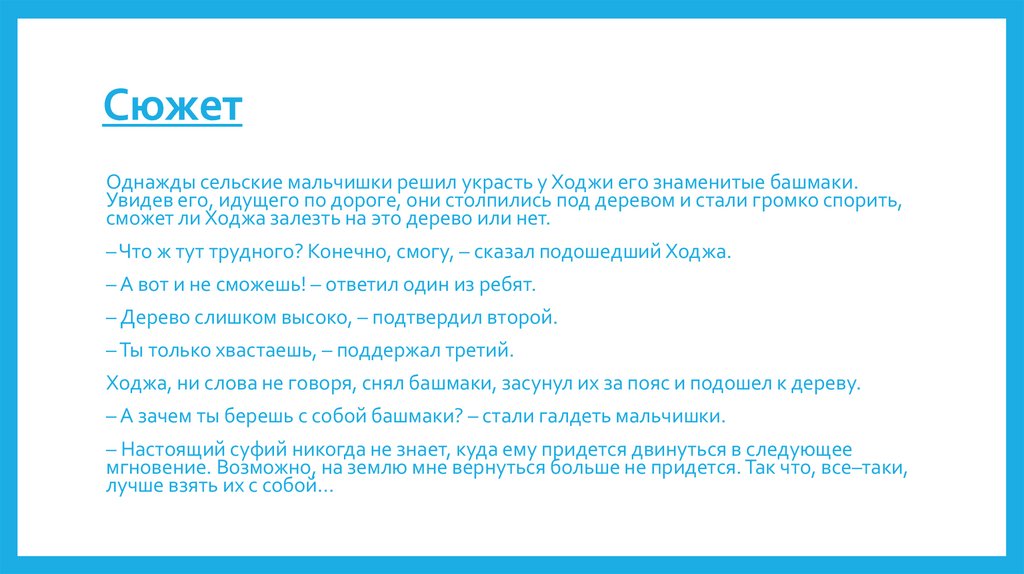 СюжетОднажды сельские мальчишки решил украсть у Ходжи его знаменитые башмаки.