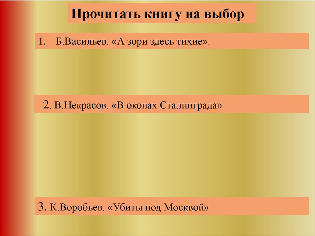 Прочитать книгу на выбор1. Б.Васильев. «А зори здесь тихие».