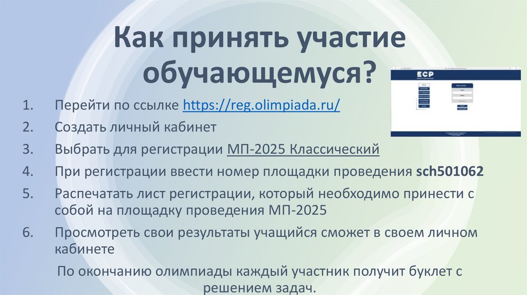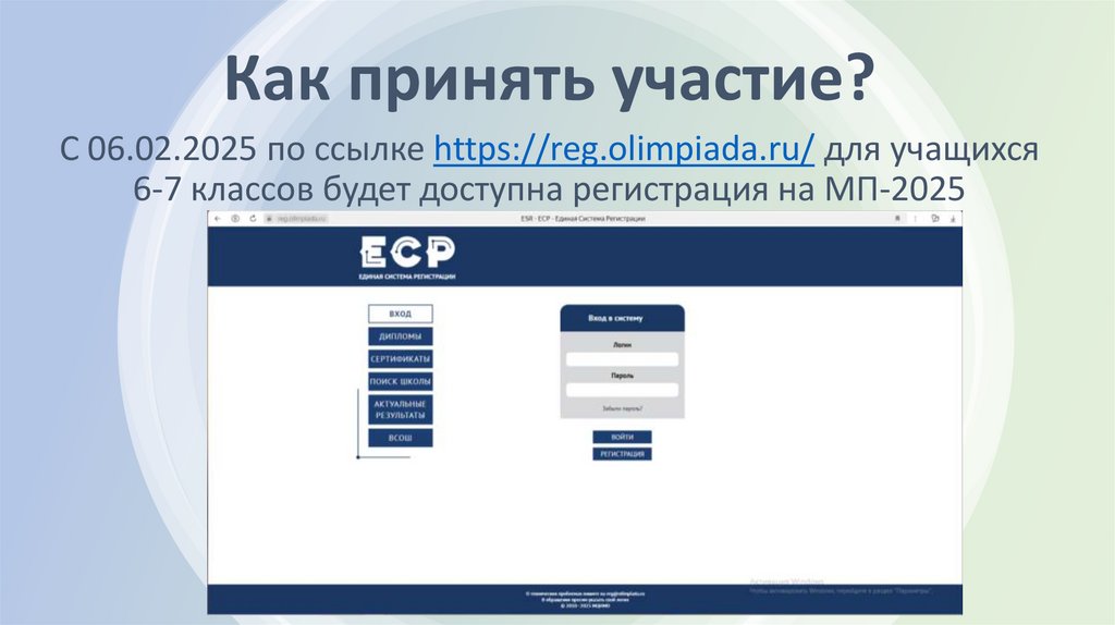 Как принять участие?С 06.02.2025 по ссылке https://reg.olimpiada.ru/ для учащихся
