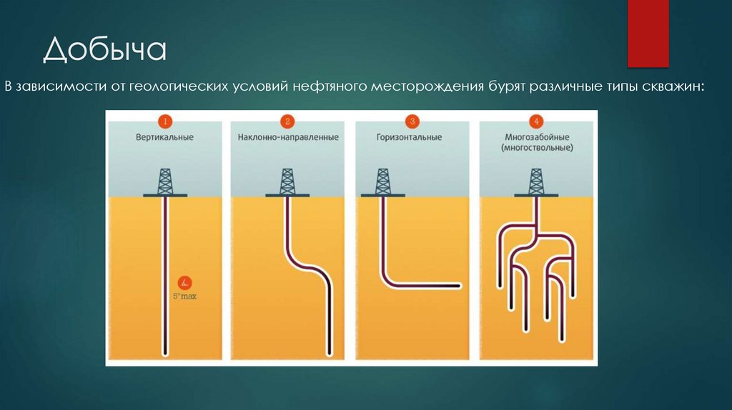 ДобычаВ зависимости от геологических условий нефтяного месторождения бурят различные типы скважин: