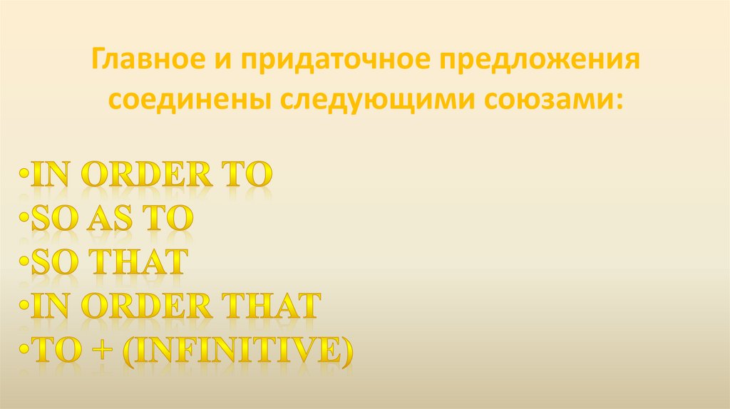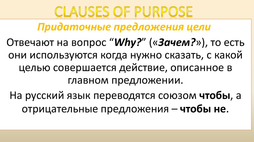 Придаточные предложения целиОтвечают на вопрос “Why?” («Зачем?»), то есть