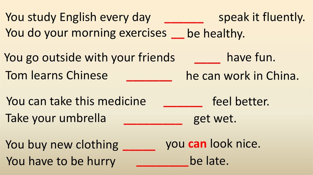 You study English every day ______ speak it fluently.You do your morning exercises __ be healthy.