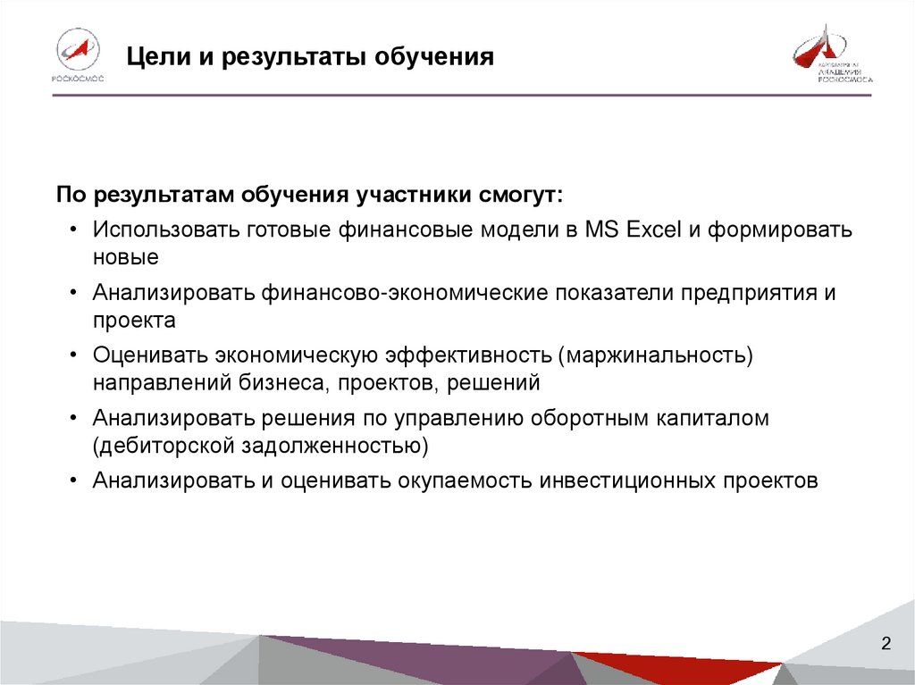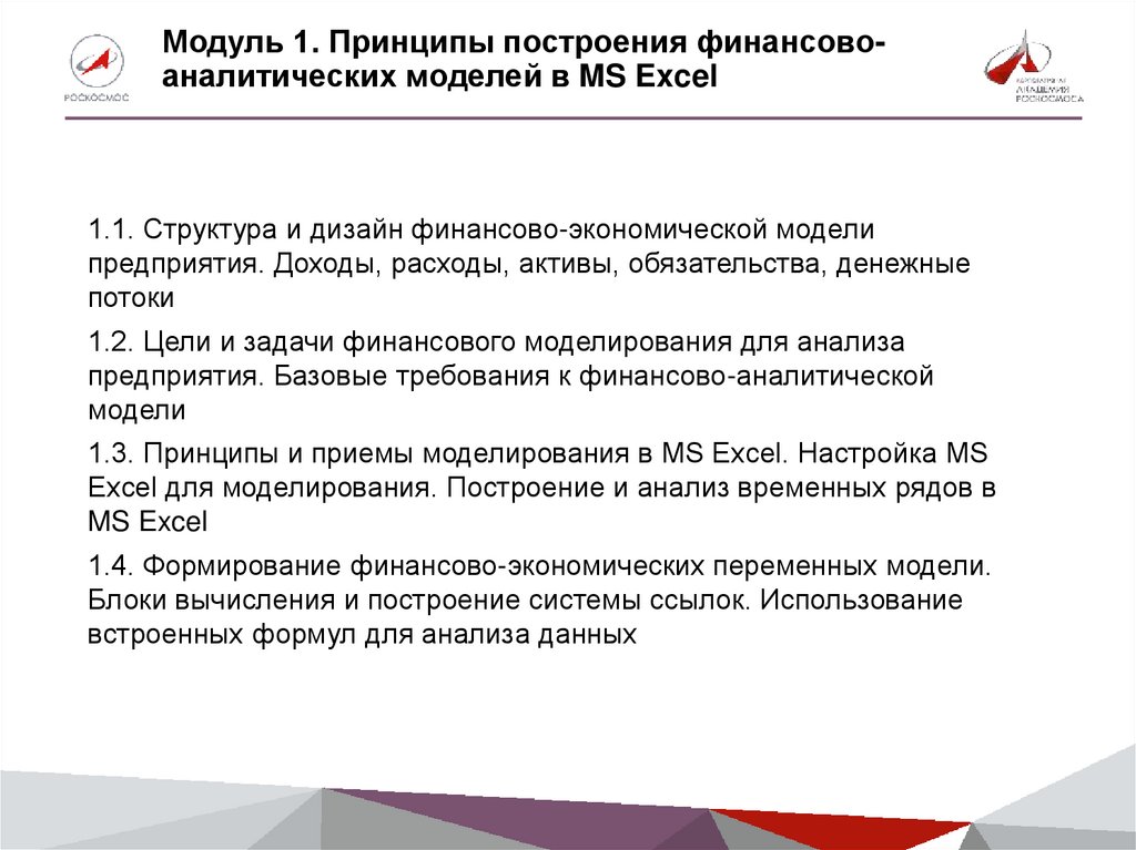 • Использовать готовые финансовые модели в MS Excel и формировать