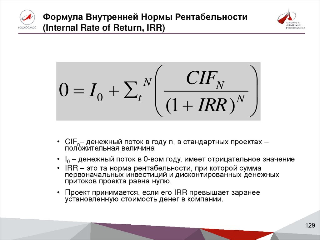 • I0 – денежный поток в 0-вом году, имеет отрицательное значение