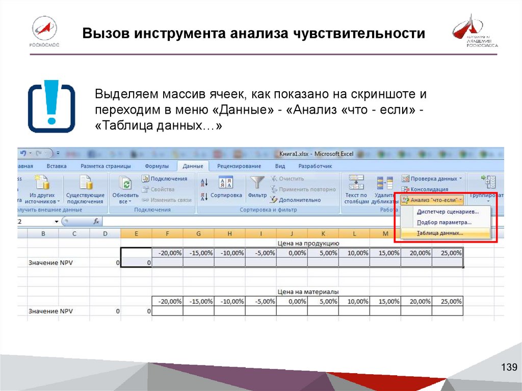 Вызов инструмента анализа чувствительностиВыделяем массив ячеек, как показано на скриншоте и