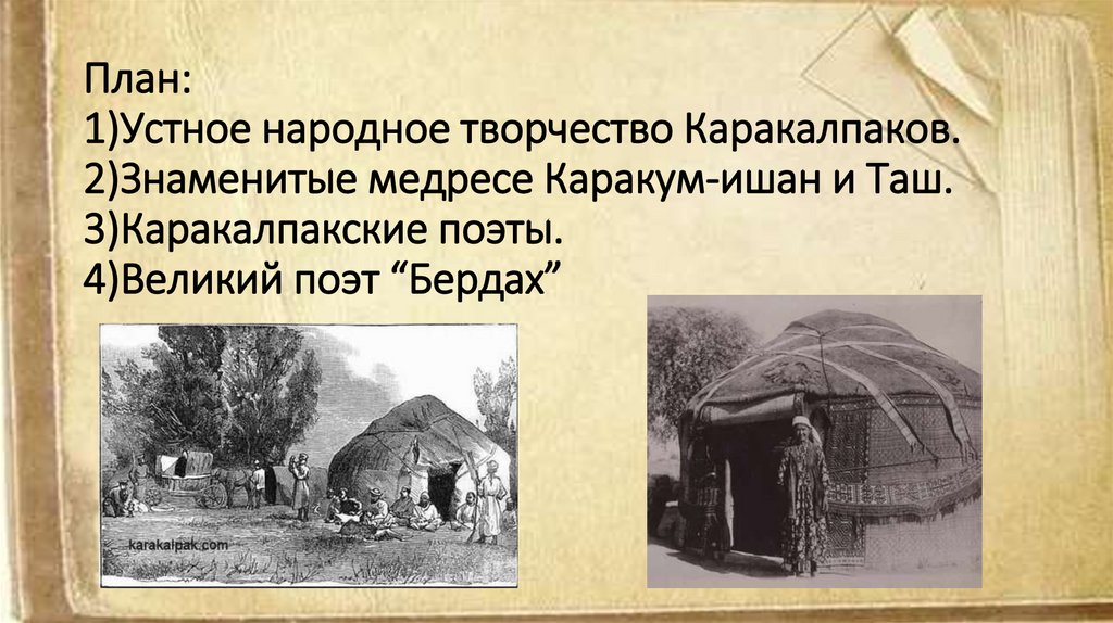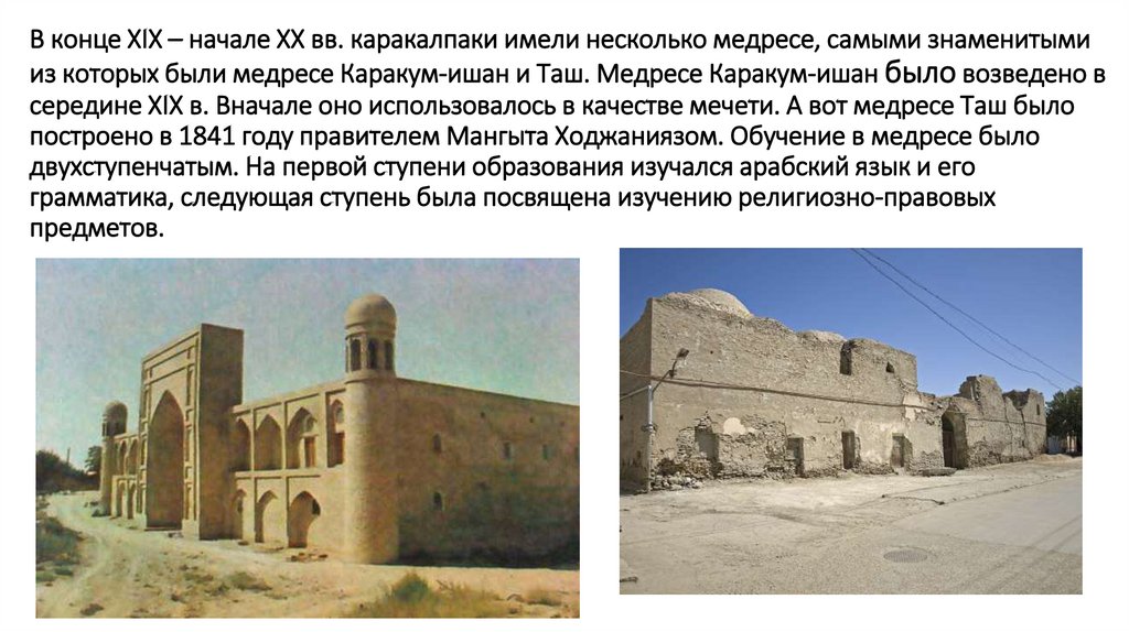В конце XIX – начале XX вв. каракалпаки имели несколько медресе, самыми знаменитымииз которых были медресе Каракум-ишан и Таш. Медресе Каракум-ишан было возведено в