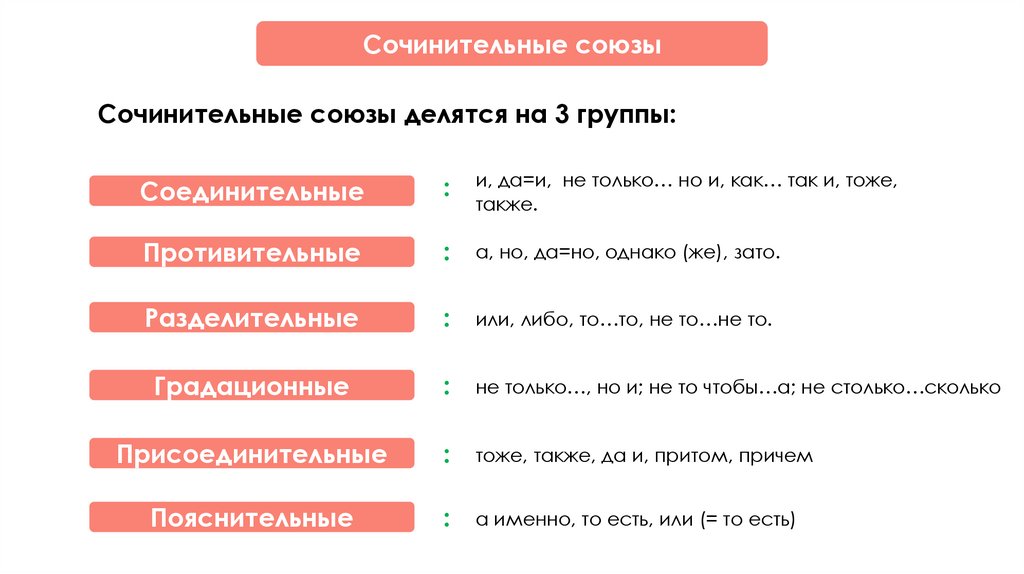 Сочинительные союзыСочинительные союзы делятся на 3 группы: