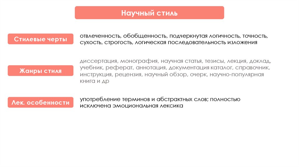 отвлеченность, обобщенность, подчеркнутая логичность, точность,