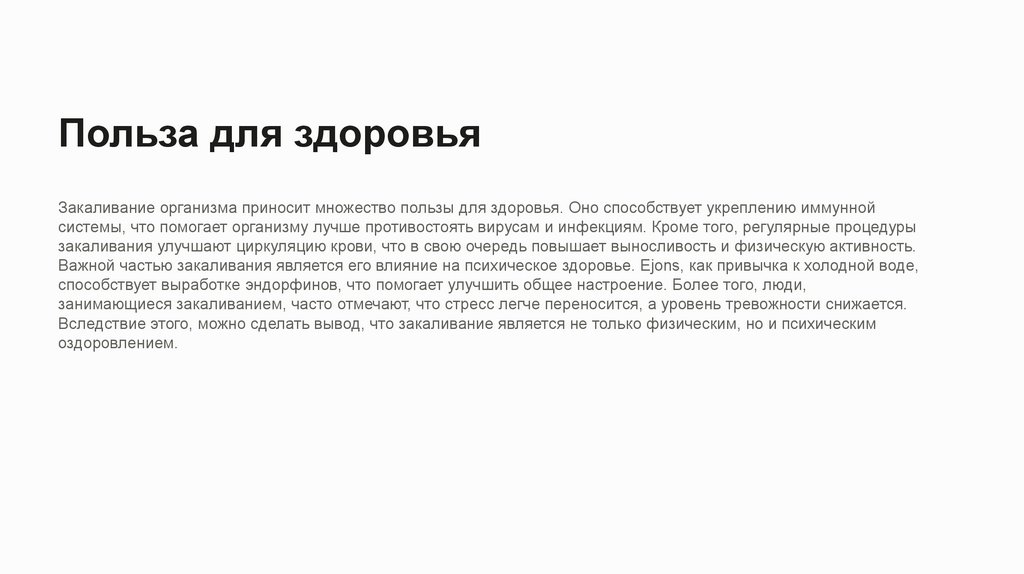 Польза для здоровьяЗакаливание организма приносит множество пользы для здоровья. Оно способствует укреплению иммунной
