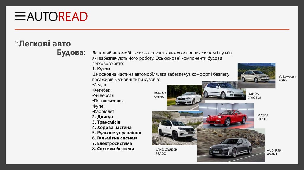 Легковий автомобіль складається з кількох основних систем і вузлів,