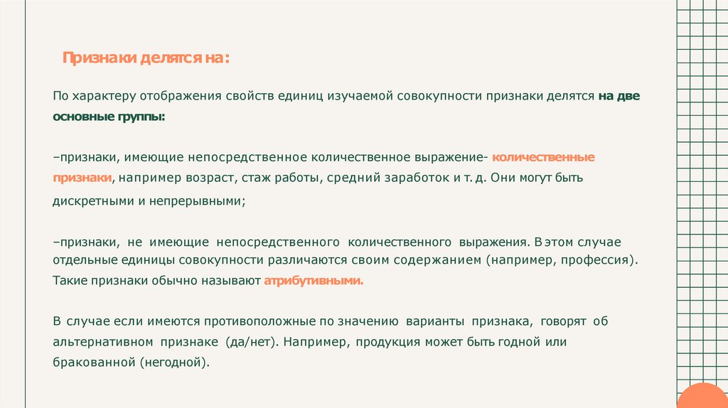 отдельные единицы совокупности различаются своим содержанием (например, профессия).