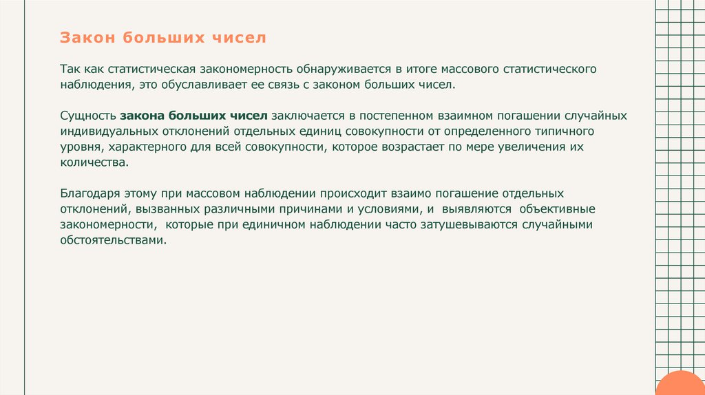 Закон больших чиселТак как статистическая закономерность обнаруживается в итоге массового статистического
