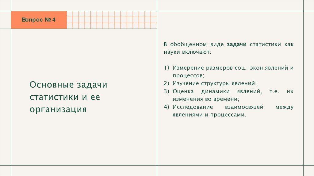 Вопрос № 4В обобщенном виде задачи статистики как