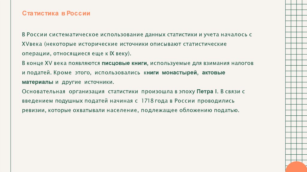 Ста тистика в РоссииВ России систематическое использование данных статистики и учета началось с
