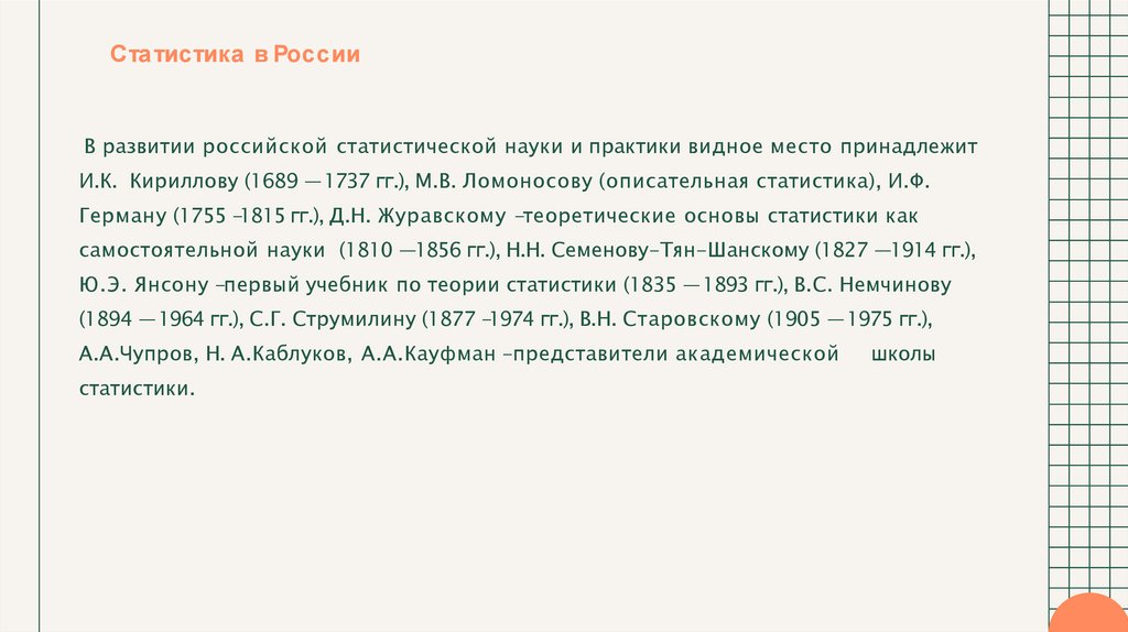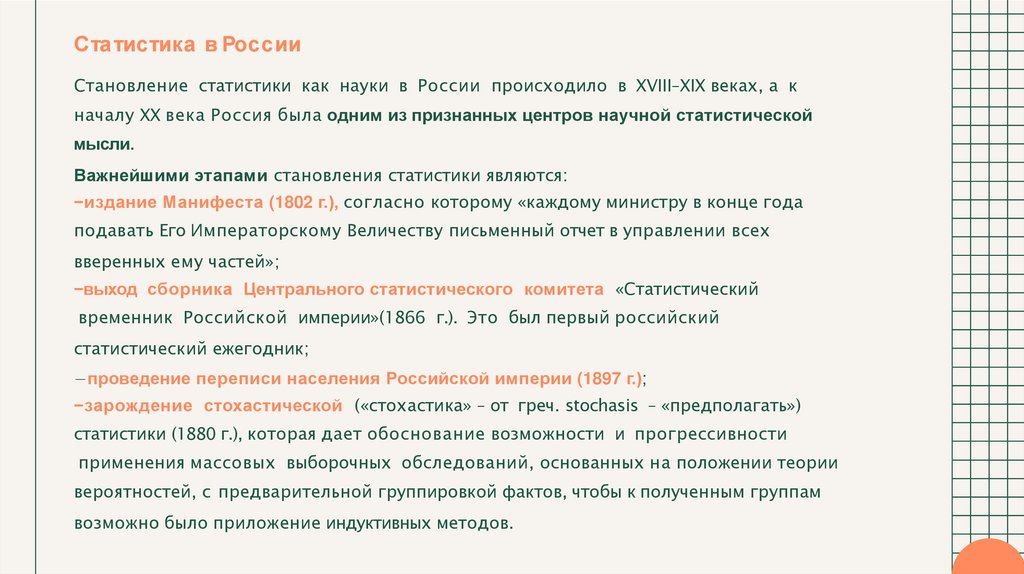 Ста тистика в РоссииСтановление статистики как науки в России происходило в ХVΙІІ–ХIХ веках, а к